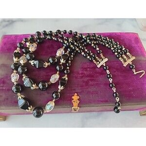 This is a vintage adjustable black, clear, and gold tone metal multistrand beaded necklace with a hook closure made in Japan.