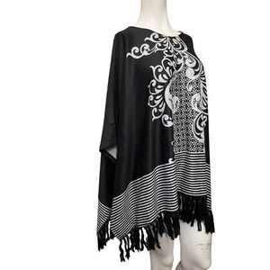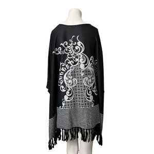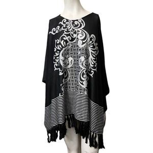 Black And Gray Poncho With Fringe Pullover One Size Ornate Design Striped NWT