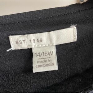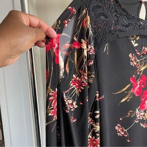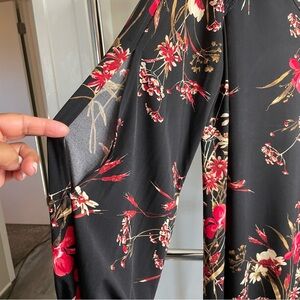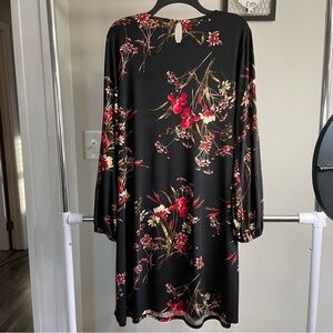 This dress features a vibrant floral pattern in shades of red on a black background. It has long bishop sleeves and a v-neck, creating a stylish and comfortable silhouette suitable for casual or semi-formal occasions. Size 14-16W.