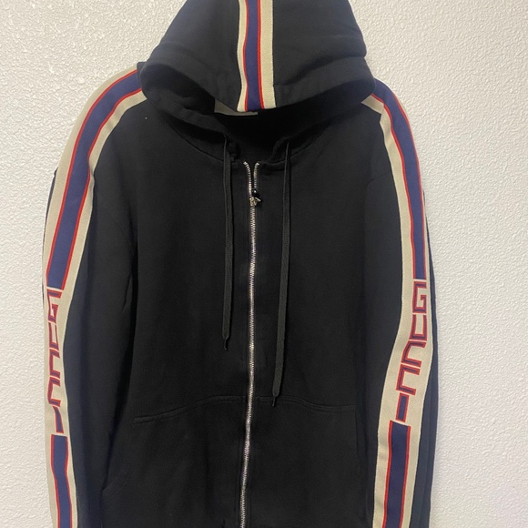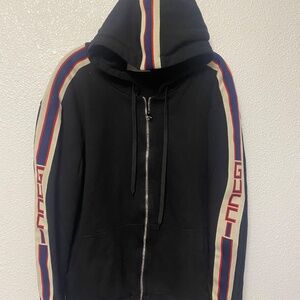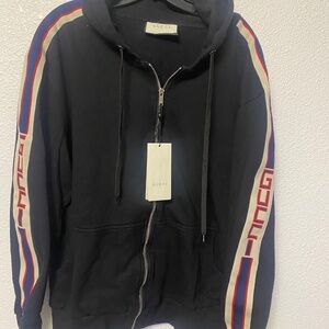 Classic black hoodie with red and black taping on sleeve and hood. Full zip. Brand new with tags. Never worn