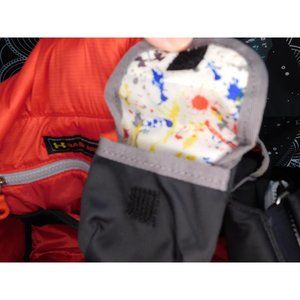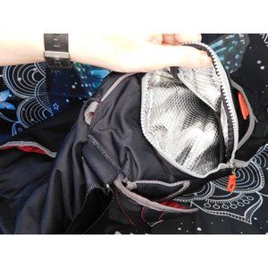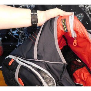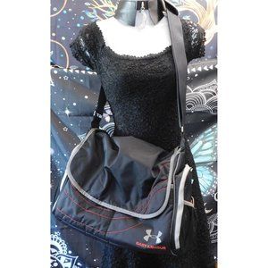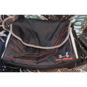 Black and red Under Armour Baby Armour diaper bag. 16 inches across. 13 inches tall. 6 inches deep. 17 inch drop. Amazing and versatile Baby Armour diaper bag by Under Armour. It's black with grey and red accents, and a red interior. It has a wide adjustable strap, with a padded comfort grip so it doesn't hurt your shoulder. It has a large magnetic pocket on the back, and two open pockets on the front. Both ends have large zipper pockets that are insulated, perfect for baby bottles and milk. There is a mesh divider/pouch in each insulated pocket. The outside of those pockets have additional mesh pockets. The insulated pockets say "hot/cold" on the outside. It has a fold over flap with magnetic closure. The interior is spacious, and has three mesh pockets, a velcro pocket, and 3 zip pockets. One of the zip pockets is marked "clean clothes" and the other is marked "dirty clothes". It has a clip chain on the inside with a removable 4"x3" velcro mini bag that's perfect for holding a pacifier. This is an amazing diaper bag, that's great for keeping everything neat and organized!
