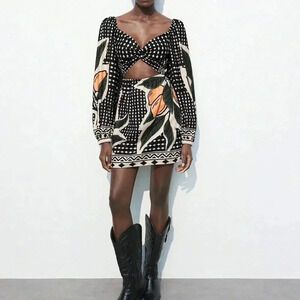 Black And White Boho Women's Floral Print Twist Hollow Out Casual Short Dress