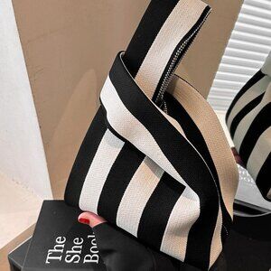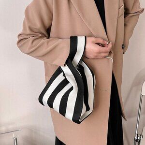 Black And White Casual Women's Handheld Crochet Woven Bag Stripe Pattern