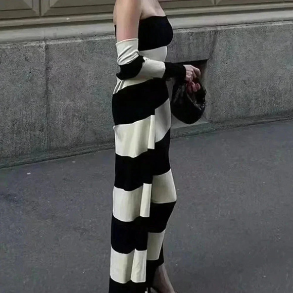 Black And White Elegant Women's Knit Mix British Style Black & White Striped Lon