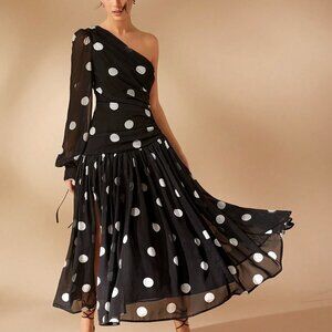 Black And White Elegant Women's Polka Dot One Shoulder Long Sleeve Maxi Dress