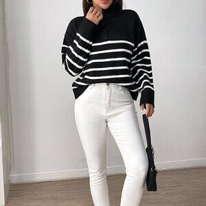 Black And White Preppy Womens Stripe Pattern Half Zipper Drop Shoulder Sweater