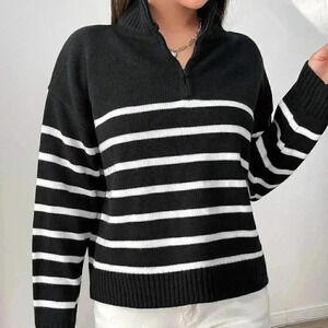 Black And White Preppy Womens Stripe Pattern Half Zipper Drop Shoulder Sweater