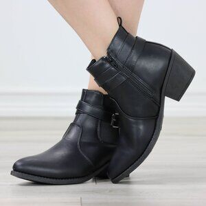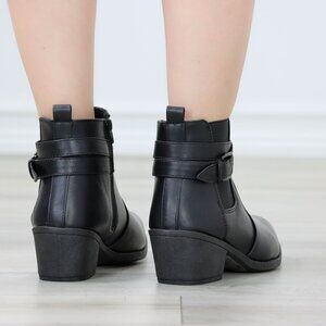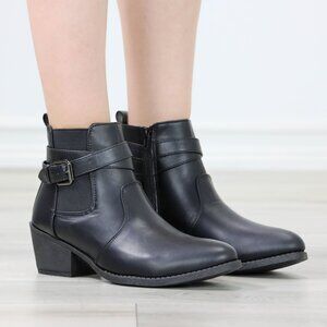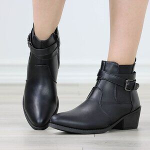 Black Ankle Boots Buckle Strap Faux Leather Low Heel Pointed Toe