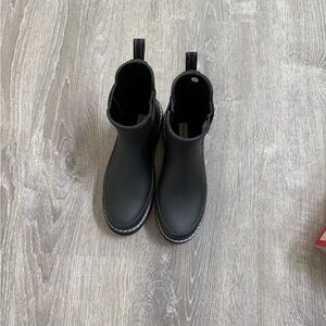 Stylish black ankle boots with a sleek design. Hunter rain boots.
