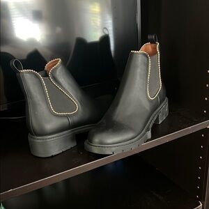 Step out in style with these chic black ankle boots featuring elegant gold trim. Perfect for any occasion, these boots offer both comfort and sophistication.