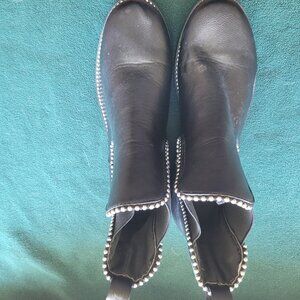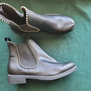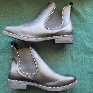Black Ankle Boots with Silver Stud Accents - Size 38. Heel measures 1". Rounded toe. Elasticized sides outlined by studs. Made in China.