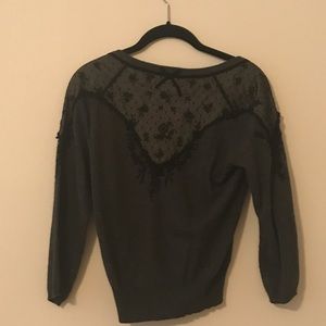 Adorable 50s style cardigan. Black lace detailing at collar and sleeves. Sweet black bow in the back. EUC.
