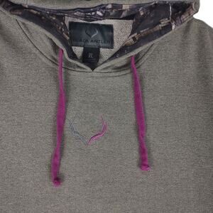 -Features: Camo lined drawstring hood, terry interior, long sleeves, embroidered antler logo on front, front kangaroo pocket