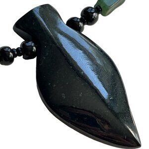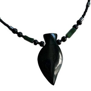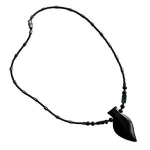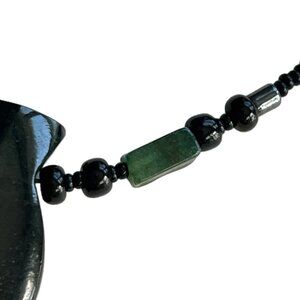 Style: Short necklace with silver and black beads, 2 green rectangular beads, and a black arrowhead/teardrop shape pendant.