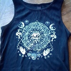 Stylish black tank top with a unique graphic design. Perfect for casual wear.