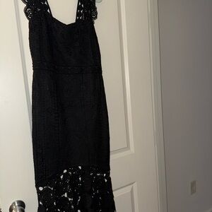 This stunning black sheath dress features an asymmetrical hemline and a sweetheart neckline, perfect for a cocktail night out. The sleeveless design enhances its modern appeal, while the backless style adds a touch of allure. Worn once!!