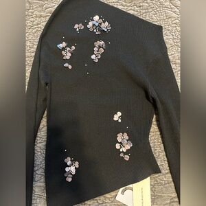 Stylish black asymmetrical top featuring floral embellishments. Perfect for a chic look.