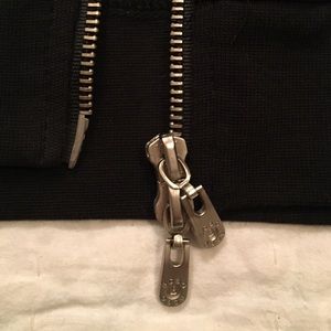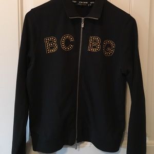 Black BCBG Max Azria Sport Stretch Jacket w/ Gold Lettering--Size Large. Metal zipper. Long sleeves. One gold bead no longer has its gold color. See pics. Very good pre-owned condition. Lots of stretch. No stains, rips, or pilling. You'll shine in this sporty jacket!