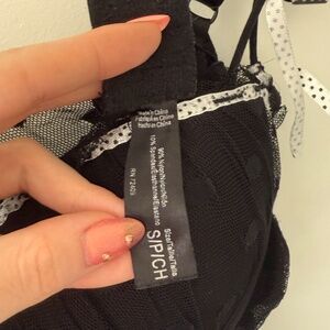 Black babydoll top with polka dot bows, has no visible flaws but is missing the brand tag.