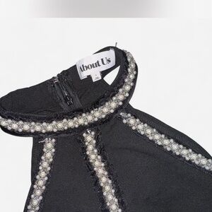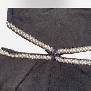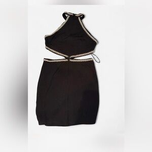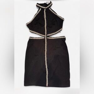 This sleek black bodycon dress features a striking backless design with a halter neckline, perfect for a cocktail night out. The dress is adorned with silver trim that outlines the cutouts, adding a modern and edgy touch to its form-fitting silhouette.