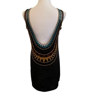 Casual black mini dress with dramatic backless detail. Thin material makes it light and airy, could even be worn as a dramatic backless top. Boxy, high neck in the front with deep backless detail in back. Very casual and can be dressed up or down. A must-have summertime statement piece.