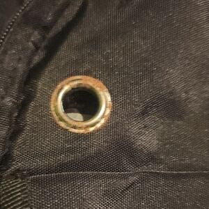 Pre-loved Stylish black backpack featuring design. Perfect for fans on the go. Only issue is the little bits of rust on what I'm assuming was a headphone jack hole?