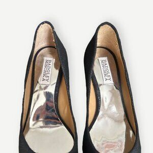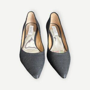 Black Badgley Mischka Kitten Heels 6.5 Metallic Fabric Crystal Heels Worn 1x