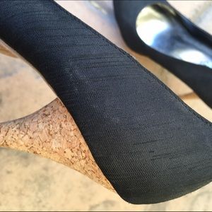 Super cute black heels with a bamboo bottom. Have been worn about 3 times, the material is hard to explain which is why I showed a closeup. Size 7!
