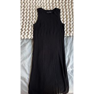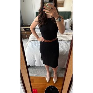 This ribbed black dress from Banana Republic. Has a ton of stretch, making it very forgiving & comfortable. Features side slid detail. Great for a day to night outfit!