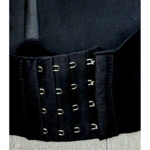 Strapless black bra in size XL with a flirty scalloped hem. Smooth minimalist features of seamless, wireless, and one-piece padding for a flattering fit. Padding is removable for desired silhouette. Boned sides and 4 hook wide band with 4 settings in a stretchy nylon/spandex for a secure fit. Includes strap loops to add your own straps if desired - no straps included. Comfort in a strapless bra that stays secure while complementing evening wear, sundresses, and silk blouses for a sleek, chic aesthetic.