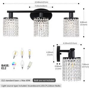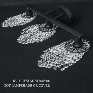 💡【Durable Quality Construction】This 3-Light black bathroom light fixtures is built in a sturdy metal lamp body with a handsome Matte Black finish and sparkle crystal strings.Luburs bathroom lights over mirror will bring more exquisite and luxurious for your home lighting. Each lamp body of this black vanity light is composed of 21 crystal hanging strings (k9 crystal) which are needed to hang them. Not a one-piece lampshade or crystal cover.