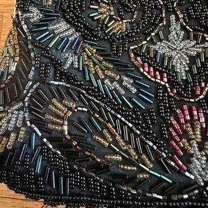 Black Beaded Evening Bag Multi Color Beads Long Chain Strap. Dark blue, maroon, black, gold and clear beads hand sewn onto a black fabric bag, Back side and around bottom and sides of bag small black seed beads have been hand sewn. Gold tone kiss clasp opening into black interior with one open side pocket. Sturdy, snake chain with a drop of 20". It is attached to hinged loops that can be turned down into the bag in order to carry as a clutch. There are some missing beads and loose threads on the backside. All beads are in tact on the front side.