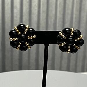 Black Beaded Flower Earrings Gold Trim Statement Studs Vintage Style Bold