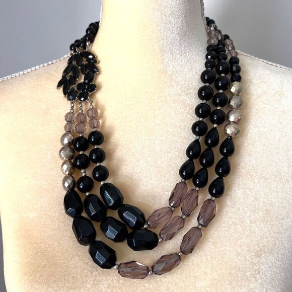 Black Beaded Multi Row Statement Long Necklace 22 in