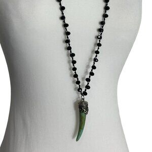 Black Beaded Necklace Faux Jade Wolf Tooth Horn Pendant Silver Tone 34" Long
