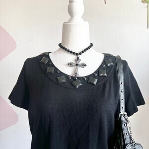 Black Beaded Neckline Top, Y2K, Boho, Glam, Vintage, Retro, Elegant, Medium