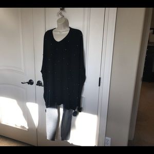 Worn once. I have a beautiful one size fits all black v neck sweater poncho adorned with rabbit hair poms and silver/black beads. Purchased in a swanky little boutique. Brand is SCMD 55. It is 32 inches long. I would say it would fit S-XL. Fabric is 50viscose/25 modal/25 polymide.