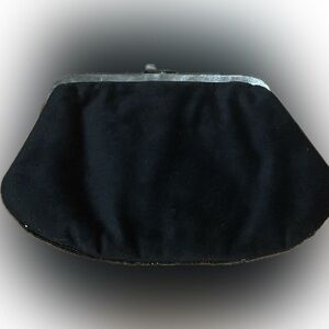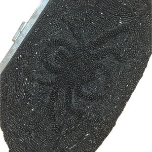 This elegant black beaded evening bag is perfect for special occasions. Its intricate design adds a touch of sophistication to any outfit. Nice kiss lock and long silver chain and velvet back.