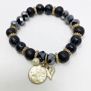Black Beaded Stretch Bracelet w/Tree, Heart & Pearl Charms