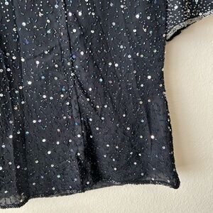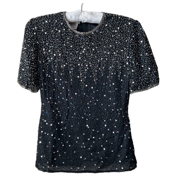 Black Beaded Top Short Sleeve Silver Sequins Bead Trim Vintage Size Petite PP