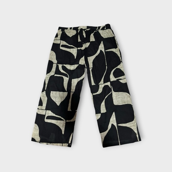 Comfortable women’s pants in black with beige abstract pattern. Elastic waist for easy wear and a relaxed straight leg. Versatile for casual or smart-casual outfits. Lightweight, breathable fabric for all-day comfort. WRAY NYC LUNA PANT