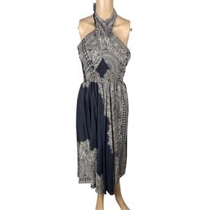 This dress is by the brand Joob Joob and is a pull on style, can be worn as a dress (multiways) or a long maxi skirt. Top is smocked elastic with long ties that can either tie front or around the neck. It has an asymmetric hem and an all over mandala print. Dress is a soft lightweight/breathable rayon fabric. Dress is in excellent condition, no flaws! Perfect summer dress for any bohemian lover!