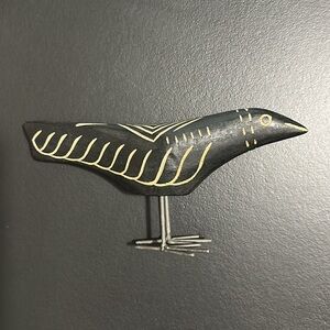 a vintage style possibly hand-carved black wooden bird sculpture with etched details.