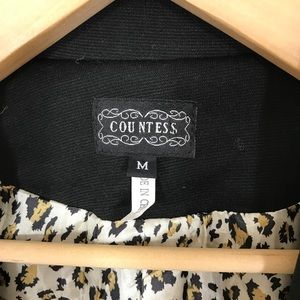 Black blazer with Cheetah lining. Sleeves can be rolled or not. Bought at shop in NY city. Worn once.