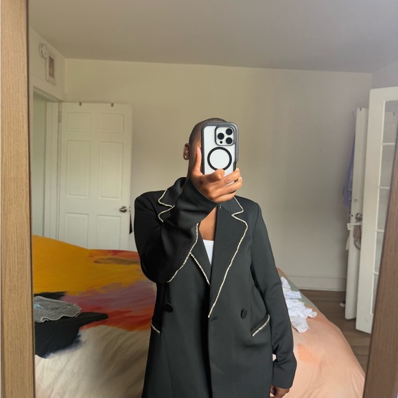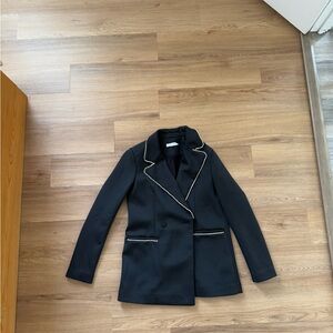 Stylish black blazer featuring elegant white trim. Perfect for any occasion. Very warm I usually wear during holiday time to the parties as an overcoat.