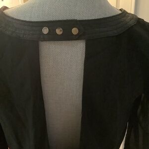 Black open back, pleated peep front, trimmed in vegan leather at neckline and waistband with three button wrist....Fabulous item to add to any collection