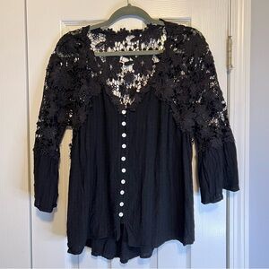 Black Blouse with Three-Quarter Lace Sleeves and V-Neckline