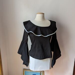Black boat neck ruffle neckline top with white trim. Three quarter bell sleeves. By Palacio. 95% cotton, 5% spandex. Made in USA. Marked a size S- measures 17" armpit to armpit, 21" long. In great condition.