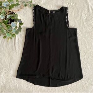 Black Bobeau tank top with scalloped detail on the sleeve in white