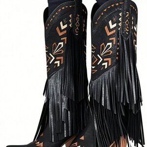 Black Bohemian Women's Fringe Tassel Cowgirl Western Chunky High Heels Boots